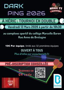 Le Héric TT vous attend nombreux pour cette soirée unique où sport, lumière et bonne humeur ne feront qu’un. Formez votre duo et venez vivre l’expérience Dark Ping 2026 🔴⚫🏓✨